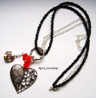 Asymetric necklace half with black beads and hald with a chain. The pedant with heart, Swarovski cristal and acrylic rose. :-) Price - 18 €.