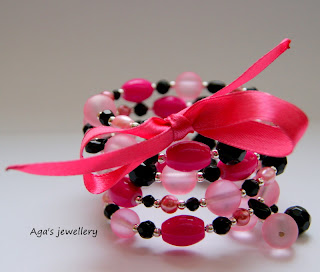 A pin-up bracelet with black onyx, frozen glass, pearls and a cute hot pink ribbon. Price - 15 €.